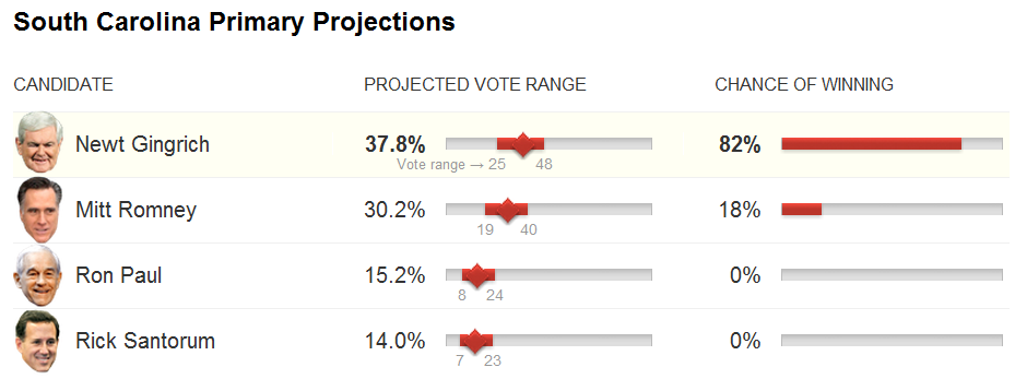 The result is that Romney’s 10 point lead has turned into a similarly strong lead for Gingrich. Indeed, PPP’s polling last night found him 14 points ahead, with 40 per cent to Romney’s 26. Nate Silver’s model (above) now gives Gingrich an 82 per cent chance of winning tonight. If he does so, he could still have a shot at the nomination, although Romney will still be the favourite.