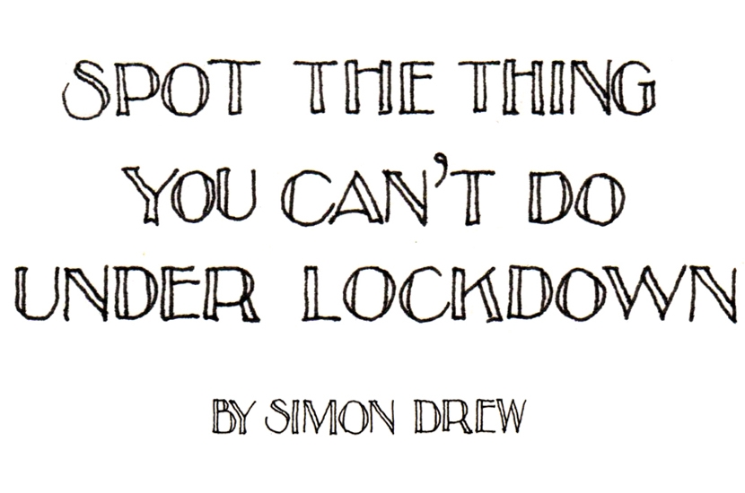 Magazine Issue: 02 May 2020 More features Magazine: 02 May 2020 Simon Drew Spot the thing you can't do under lockdown From magazine issue: 02 May 2020 issue 02 May 2020 Text settings Text size Small Medium Large Line Spacing Compact Normal Spacious Comments Share Share Simon Drew Spot the thing you can't do under lockdown Copy link Copied Linkedin Messenger Email You can find the answers here