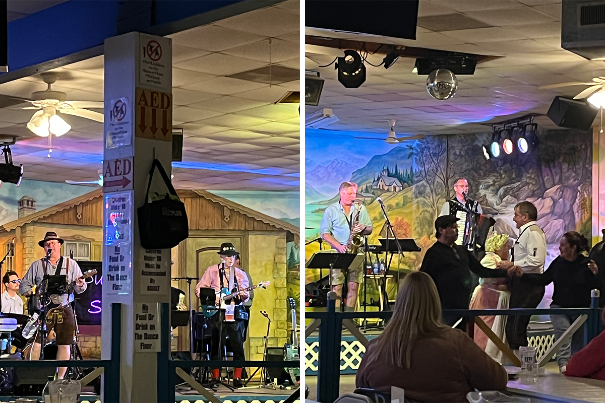 On our weekend, we were treated to the stylings of Duncan Schön — a family act from Cincinnati, Ohio, consisting of a father, a grandfather, two sons and a guest accordionist from Slovenia — and Alpenmusikanten, who hail from Dallas, Texas, but include a couple of German ringers, Wolfgang and Manfred, both of whom yodel tremendously. One gent was so taken by the music that he deigned to propose on the dance floor: she said yes!