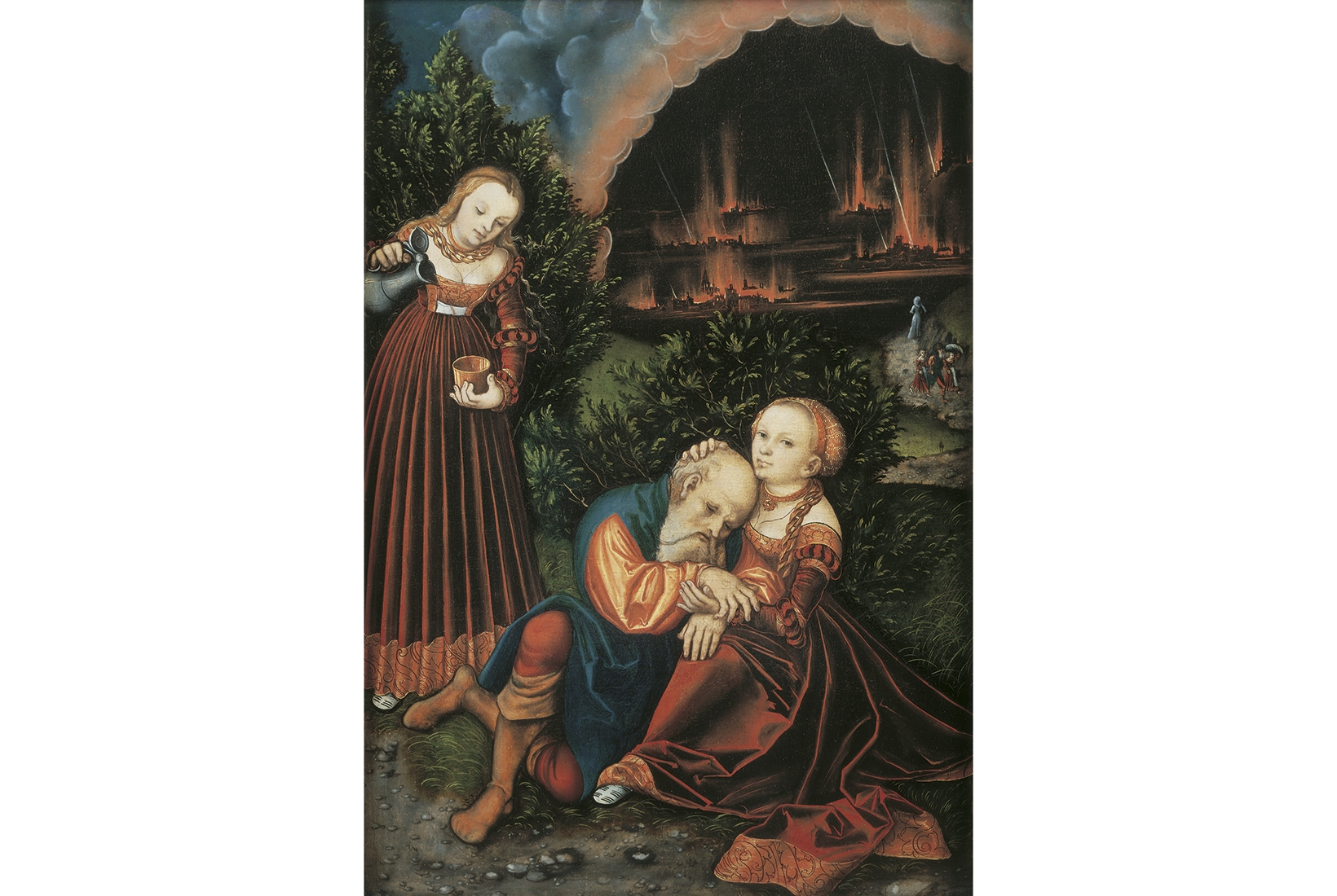 We meet Cranach not only as painter, but also as entrepreneur and Reformation mover and shaker. Lucas Cranach the Elder (1472–1553) was court painter to Frederick the Wise, friend and publisher of Martin Luther, three times mayor of Wittenberg and one of the two richest men in the city. But why look at black-and-white books? You want the good stuff: the Dianas, the Venuses, the seductive sisters in ‘Lot and His Daughters’ (c.1530) wearing scarlet and umber dresses in the same rich pigments as the distant, burning Sodom and Gomorrah.