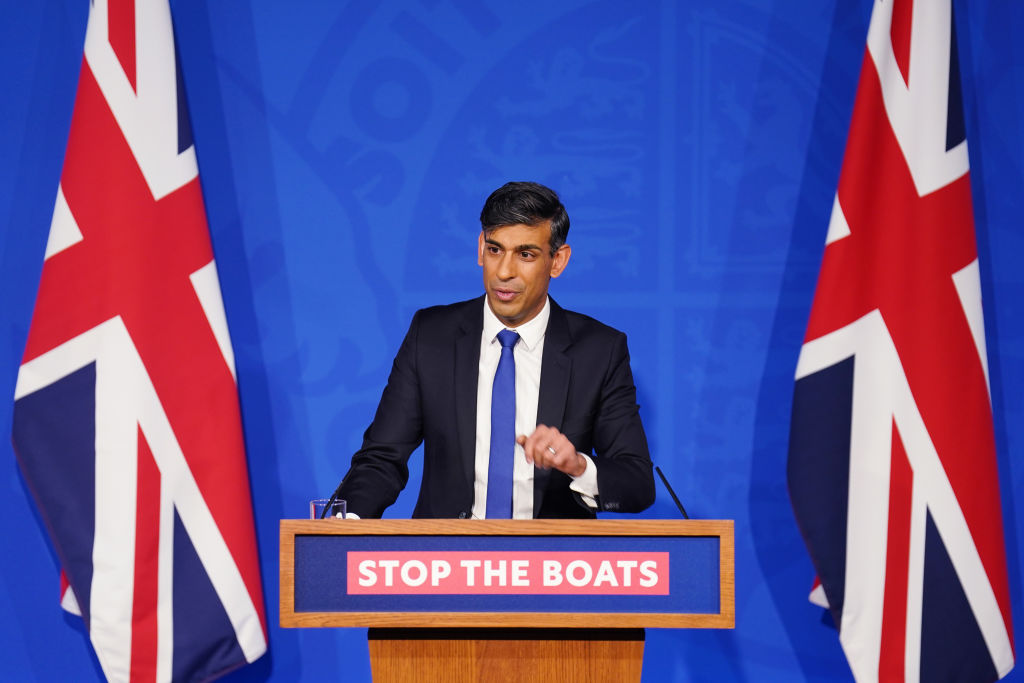 After the resignation of Robert Jenrick last night, Rishi Sunak sought to get on the front foot this morning with a press conference in No. 10. The Prime Minister cut a somewhat frustrated figure as he defended his new Rwanda legislation, insisting that it ‘blocks every single reason that has ever been used to prevent flights.’ ‘The only extremely narrow exception will be if you can prove with credible and compelling evidence that you specifically have a real and imminent risk of serious and irreversible harm’ Sunak told reporters.