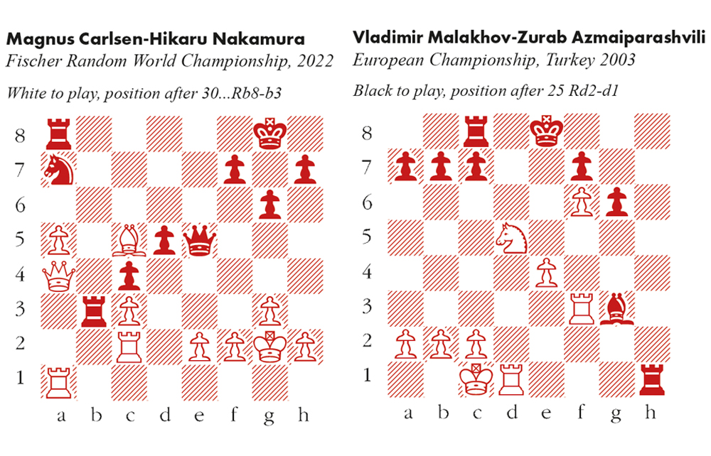A famous fingerfehler occurred on the top board at the European Championship in 2003. (On that day, I was playing against Alexander Grischuk on board 4.) Reaching the position in the second diagram, Zurab Azmaiparashvili intended to exchange rooks on d1 and then flee with the bishop, but his hand picked up the bishop first. According to Malakhov’s account, his opponent said something like ‘Oh, first the exchange of course’, put the bishop back and carried on. Of course, this was absolutely forbidden, but Malakhov was too stunned to prevent things from taking their course. He noted that he ‘didn’t want to ruin the logical development of the duel’, which is remarkable because he surely knew that after 25…Rxd1+ 26 Kxd1 Be5, with the f6 pawn weak and c7-c6 on the way, he would face an uphill struggle to save the game. ‘Azmai’ did indeed win the game, even suggesting to split the point at the end of it. But the win for Black was allowed to stand, and he went on to win the tournament, half a point ahead of Malakhov.