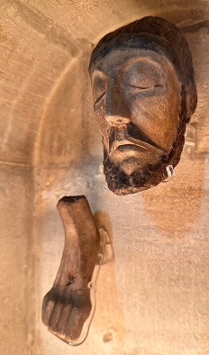 Despite the gauntness of Christ’s foot, it is an object of touching beauty. Rendered in pale fleshy tones with a puncture hole where it was pierced by a nail, its angular toes are bent in agony. Christ’s head is so small that it could be held in cupped hands. His eyes are closed, delicate eyelashes rest on prominent cheekbones above a downturned mouth, and a drooping triangular moustache conveys a mysteriously calm repose.