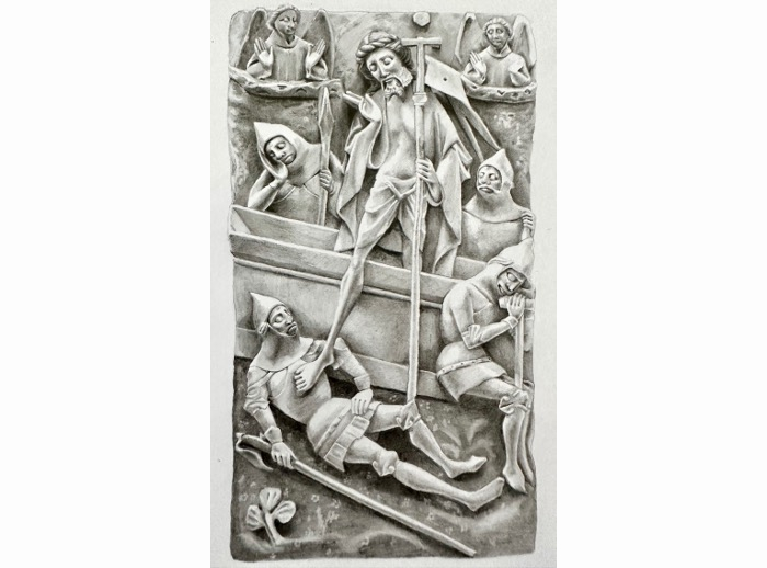 A Resurrection altarpiece Reredos showing Christ leaving the tomb (Illustration by Clare Venables)