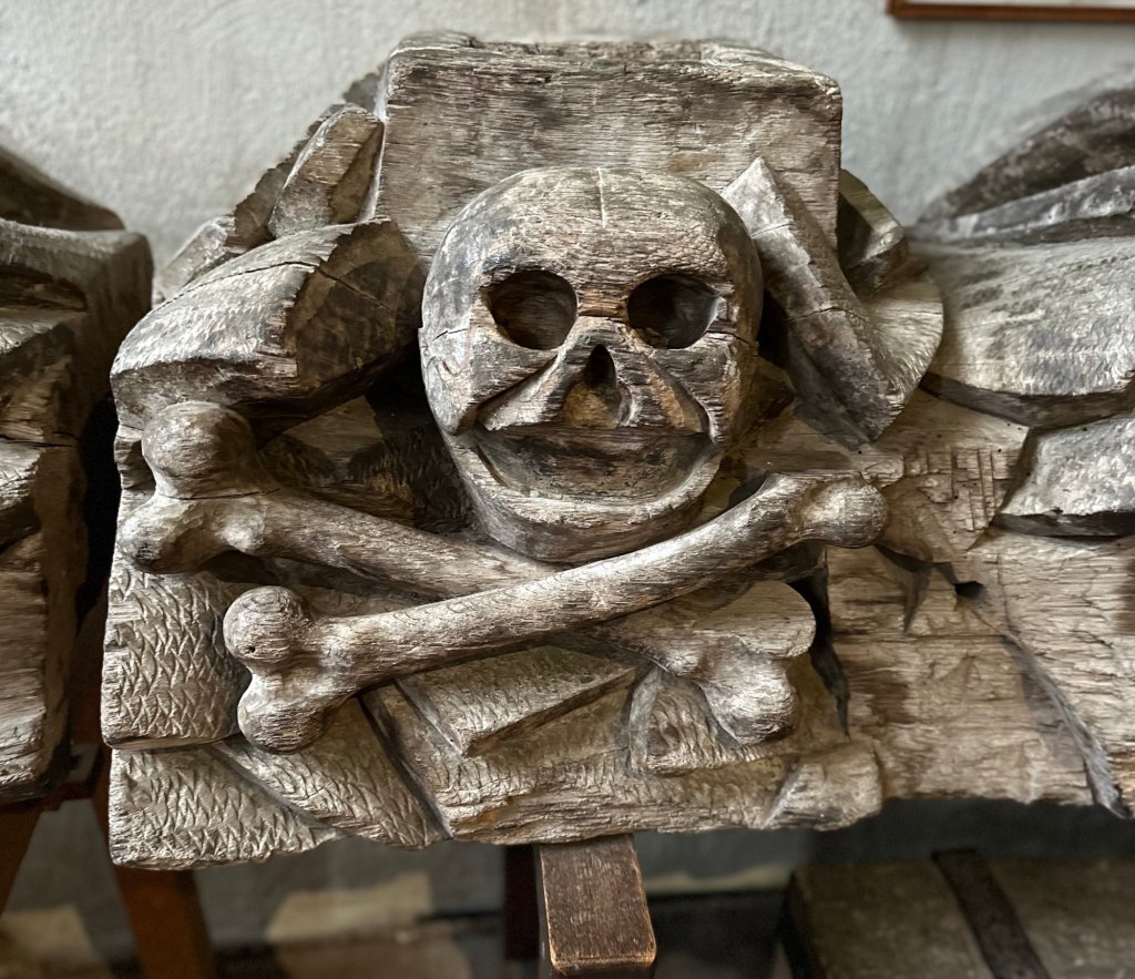 Many carvings of the Crucifixion were fixed into a lower carved piece that depicted Golgotha (also known as Calvary) with rocks bestrewn with skulls and bones that would have sat atop a Rood Screen that divided the Chancel and Nave. Only one such example survives, at St Andrew’s in Cullompton, Devon – and it is a mighty and gruesome artwork, hewn out of a single tree trunk in the fifteenth century and then cut into two sections the same width as the flamboyant late-fifteenth-century rood screen that still survives.