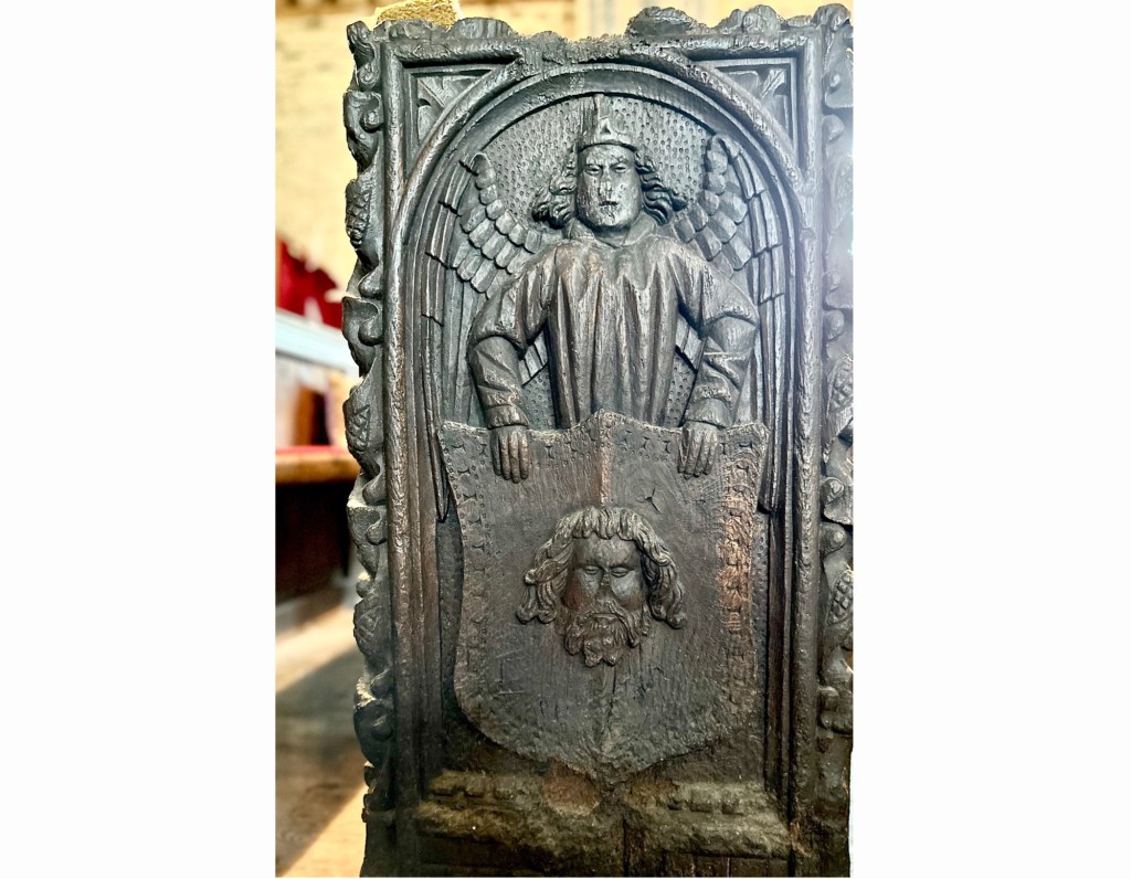 At St Nonna’s in Altarnun, Cornwall, the Tudor bench ends are carved with images whichwere subsequently prescribed during the Reformation, such asone showing Christ’s five wounds (from the nails in the cross and the Holy Lance) which was a subject of devotion in the Middle Ages. One of the benches features a portrait of Christ held on a handkerchief by an angel known as a ‘vernicle’. It is an image that St Veronica caught when she wiped the face of Christ on his way to the cross, causing his features to appear upon the cloth miraculously.