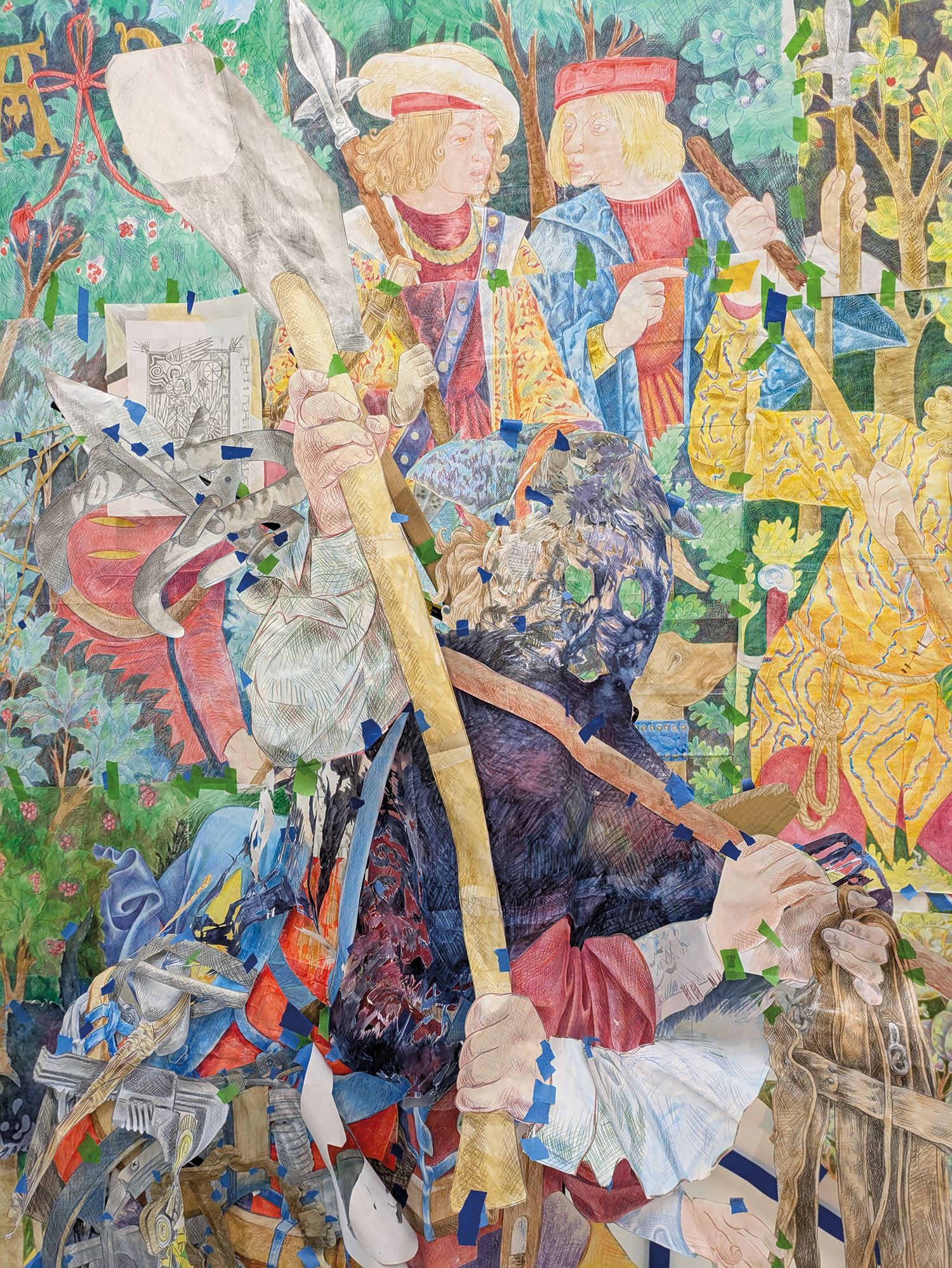 The work that comes closest to the lurid intensity of actual conspiracism is Sam Keogh’s ‘The Unicorn Crosses a Stream Cartoon’, in which a 16th-century tapestry is interrupted with fragments of modern life, CCTV cameras, smartphones, plus a mysterious sign that Friedrich Engels described as the ‘secret identity stamp of the peasants’. It’s a fun melange; you could spend a few minutes working out the connections between the images, as with Aby Warburg’s own brilliant clusters of portentous forms. But it’s a shame that none of what our professional artists can come up with is as creative or as arresting as the alien worlds strange and nameless people create on walls at night.