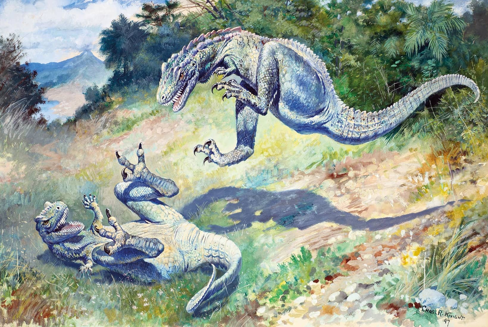 The 20th century brought a very different kind of monster. For more than 40 years from the mid-1890s, Charles R. Knight was the in-house paleoartist for the American Museum of Natural History in New York. He was also legally blind. He painted while squinting at a canvas only a few inches from his face, but the dinosaurs he depicted are full of light and life. ‘Leaping Laelaps’ (1897), one of his most celebrated works, shows a bright, impressionist summer hillscape in splotches of pale paint; Knight knew, like Pissarro, that ‘nature is coloured in winter and cold in summer, there’s nothing colder than full summer sun’. Two dinosaurs are fighting; one is poised in midair, with talons flexing and a whipping tail. Where previous dinosaurs had been colossal but slightly shapeless bags of flesh, Knight’s creatures are scrawny, all sinews and coiled muscle. This was the image that stuck around.