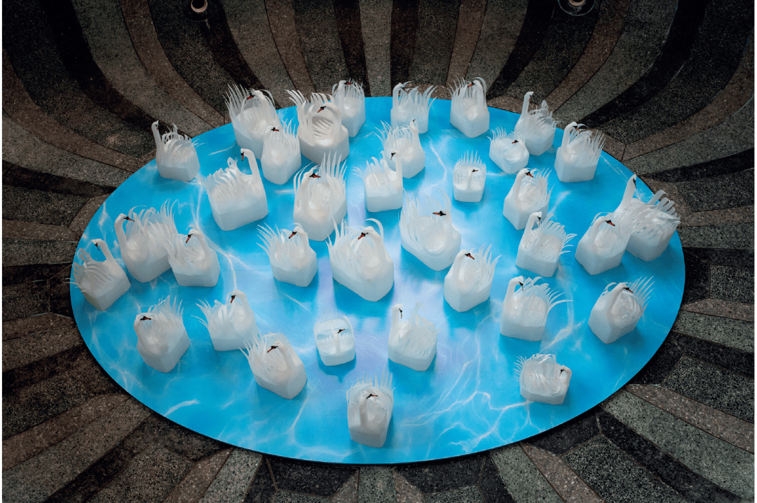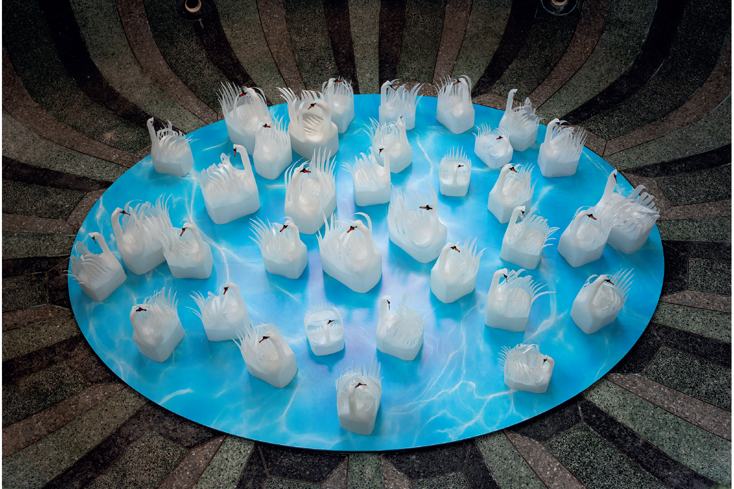 Household plastic waste is her preferred medium, stemming from a burst of productivity under lockdown. Bold necklaces are made from printer-cartridge caps, insects from cartons, and bouquets from bottles. Where Michelangelo sees statues ready to be freed from blocks of marble, Vriesendorp liberates swans from milk jugs. A lake of them frolic in the house’s jacuzzi, famously shaped like an upturned baroque dome. Not taking out the bins has been turned into an art form.
