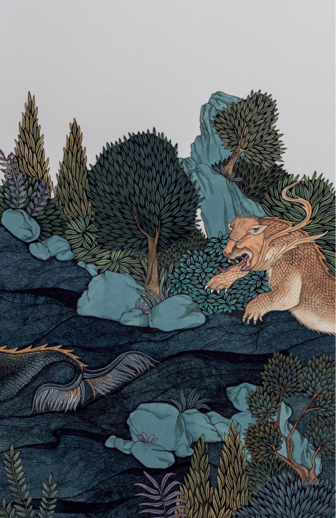 Down the road, another house-museum is hosting new artistic guests. Leighton House, the former home of artist Frederic Leighton, is a jewel of Victorian orientalism, with its Arab Hall adorned in 16th-century Damascene tiles. Pakistan-born artist Maha Ahmed shares Leighton’s spirit of gazing to the Orient, but in this exhibition she looks even further east – to Japan. Classically trained in Lahore in miniature painting, a tradition with Persian and Mughal influences, Ahmed renders fantastical landscapes exquisitely with this technique. Among rock formations and trees are a menagerie of Japanese cranes, monkeys and beasts, all painstakingly etched with fine squirrel-hair brushes (see below). It has a melancholy air. The cultural and linguistic alienation that she felt while working in Tokyo for three years seeps into the paintings. Traditional motifs from Japanese visual culture are common in her work. None of these are imitations, but reinventions: she paints chimeric beasts that combine features across species as she traverses cultures.
