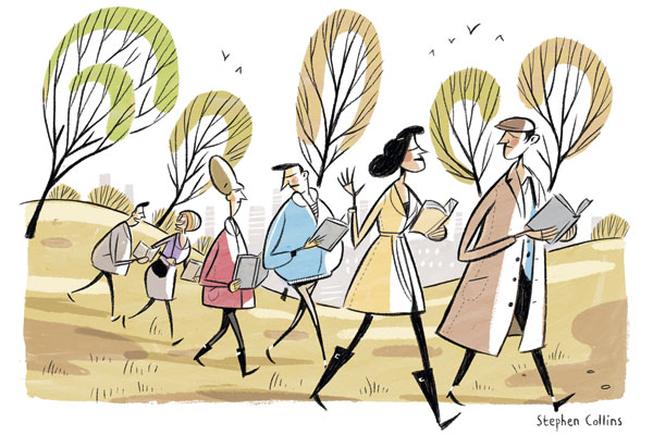 The walking book club seemed to work straight away. On that first April Sunday — the air bright, sweet and mild — eight people turned up, thrilled to have read a brilliant book, and looking forward to having a walk and a talk about it. They were all perfect strangers and yet here they were tramping across the heath together, bound by this appreciation of walking and reading. It was refreshing that this was all we had in common. There was no time wasted gossiping about friends, or whingeing about work, or any of life’s other distractions. This was an hour of pure bookchat. Well, pure-ish – people relate to books in a personal way and inevitably there are moments where we end up talking about our own experiences in relation to the book. It’s only when I hear people discussing their weekend plans that I gently bring them back to the book.