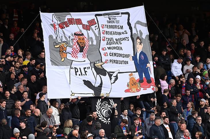 Then blood money funnelled into the team a few weeks ago and now I’ll admit the burden of fanship feels unbearably heavy. It’s a bad sign for undying loyalty when you find yourself rooting for the other side: in my case, Crystal Palace last weekend. Not the team, but the fans, who were holding up a massive banner depicting our new owners — Saudi Arabia Public Investment Fund — as an Arab oligarch holding a bloody sword, next to a list of the human rights abuses committed by the Saudi regime, including ‘beheadings’, ‘censorship’ and ‘persecution’.