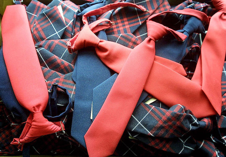 It wouldn’t be so bad if the uniforms were actually of decent quality. But they are always awful: the worst type of polyester blazer that gets so abused that it ends up threadbare, ripped and covered with ink stains (at my kids’ school, the fashion is to tear off the red trim); a ridiculous ‘tie’, often clip-on, bearing an often inane logo, in which no reasonable person would be seen dead; and either half-mast trousers of poor material with rips in the knees or skirts that represent a battleground of teenage sexuality and adult repression. (The kids roll the tops to make them shorter. The teachers ban the practice. Round and round it goes.) The lack of respect children feel for their uniforms are evident in the speed at which damage is done to them the very first day they are worn. The very first day. If you have kids, you know what I’m talking about.