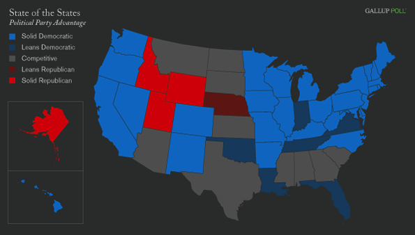 Just in case the GOP needs another reminder to broaden its coalition if wants to make headway in 2012, here’s a new study from Gallup. It finds that just 5 states – representing 2 percent of the population – can be classed as Republican (i.e. a significant plurality of adults there identify themselves as Republicans). Against that, there are 35 Democratic states and 10 “competitive” ones. Here’s the graphic which illustrates it all: