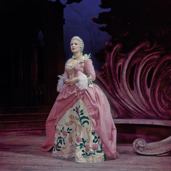 Even if his initial sketches, dashed off in one session, were so impressionistic that seamstresses were hard put to interpret his intentions, he lavished as much imagination on costumes as he did on the scenery, relishing the textures of taffeta, chiffon and silk. Sadly few of these have been preserved, but a centrepiece of the exhibition is the Marschallin’s gorgeous midnight blue and salmon pink gown from Rosenkavalier, worn by two great sopranos, Régine Crespin and Montserrat Caballé. Props also engaged him: Messel may have drawn vaguely, but he was meticulous and resourceful in the atelier, hands on and dirty, making do and mending with the detritus of pipe cleaner, cellophane, sticky tape, papier-mâché, sequins, and staples to conjure up the silver rose for Rosenkavalier or the Countess’s mirror in Figaro.