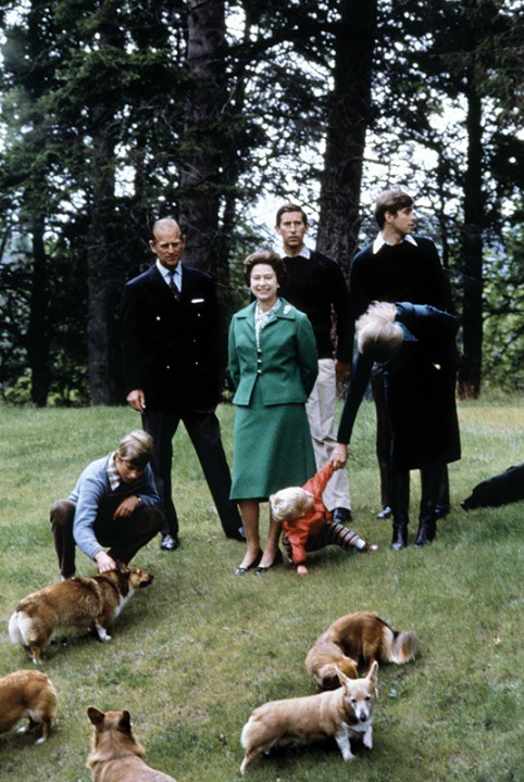The late Queen Elizabeth II and Duke of Edinburgh pose with their children, Charles, Edward, Andrew and Anne (with her son Peter) and the royal corgies for their 32nd wedding anniversary, at Balmoral Castle, Scotland, 20 November 1979 AFP Via Getty Images