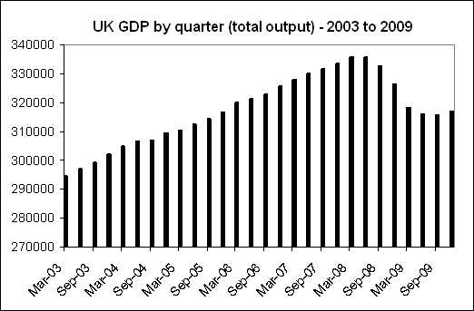 The longest recession suffered by any major country in this cycle seems thankfully to be drawing to an end, even if only by the narrowest of margins. Such has been the severity of the downturn though, that, as the above chart shows, GDP has fallen back to the levels of mid-2005. The economy is basically the same size as at the time of the last election. This means for probably the first time in modern British history, living standards have failed to rise for almost the entire duration of a Parliament.