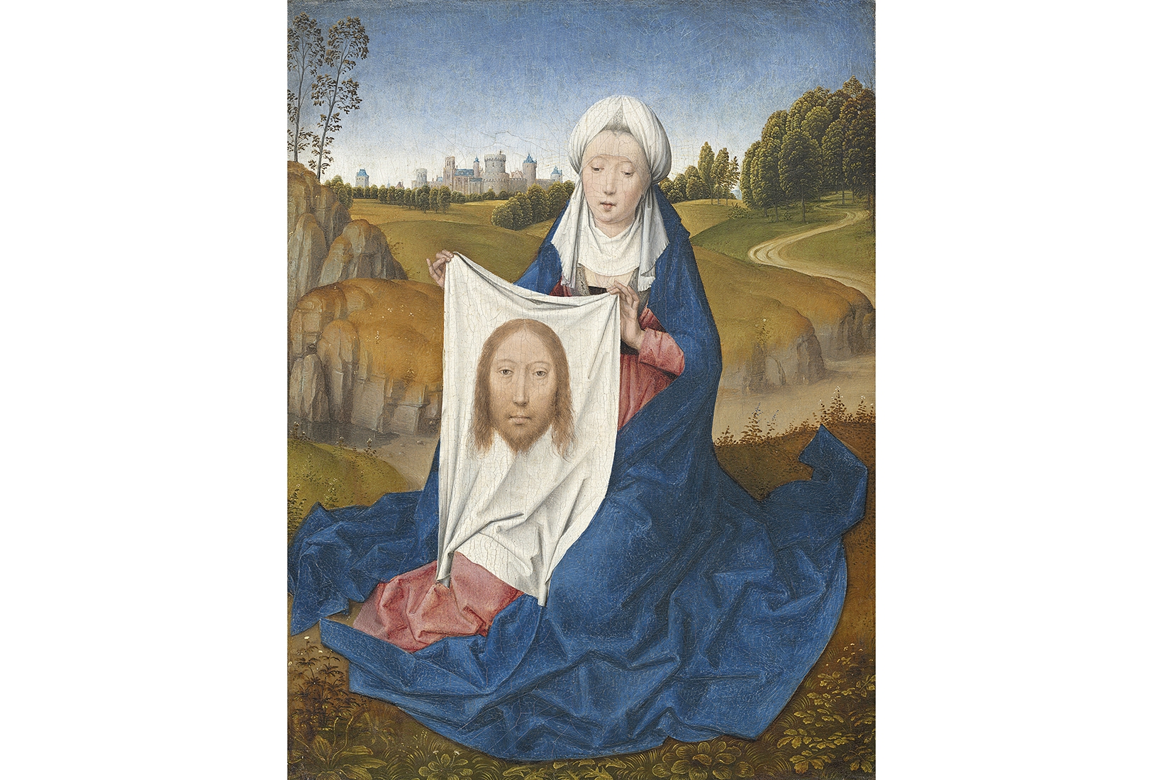 Veronica can be peaceful or dynamic. In Jacopo Bassano’s ‘The Way to Calvary’ (c.1544-5) in the National Gallery in London, Veronica rushes towards Christ like a nursemaid hurrying to wrap a shivering child in a towel. The cloth is pristine, still awaiting its divine impression. The corners are scrunched in Veronica’s hands. It’s such a plausible detail. Bassano hasn’t made it up: he’s seen someone hold a cloth just like that. Also in the National Gallery is ‘Saint Veronica with the Sudarium’ by an anonymous German master of the early 15th century. Here, Veronica, so dainty, so pinchingly neat, might be a Hausfrau giving her favourite tea towel an airing. In Hans Memling’s ‘Saint Veronica’, in the National Gallery of Art in Washington, Veronica sits in a field outside a walled city and contemplates her cloth. You can imagine, somewhere beyond the bounds of the picture, at the furthest end of the path, the horrors of the Crucifixion and events Veronica cannot bring herself to see. The Baroque Veronica made in marble by Francesco Mochi for Saint Peter’s flourishes her cloth like a matador’s cloak. Indeed, the most common pass with the cape in bullfighting is known as the ‘veronica’.