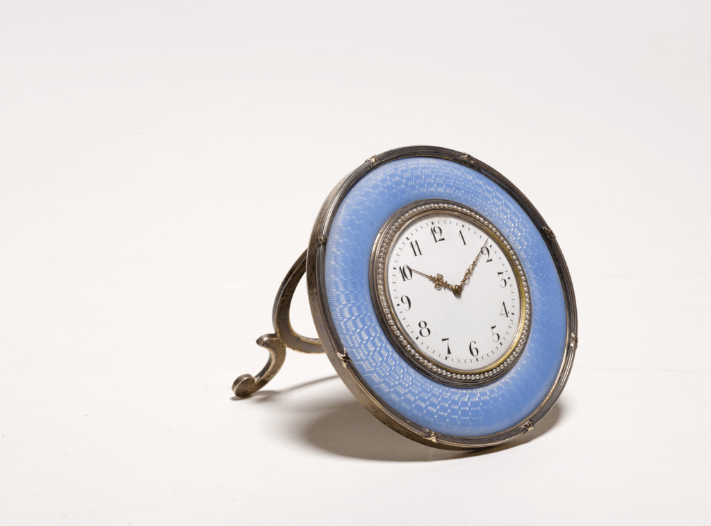 5. Faberge table clock. Lord Mountbatten was closely related to Russian royalty and was the nephew of the last Tsarina. This late 19th/early20th century Faberge clock came from the Countess’ bedroom at Newhouse. Estimate £15,000 – 25,000.