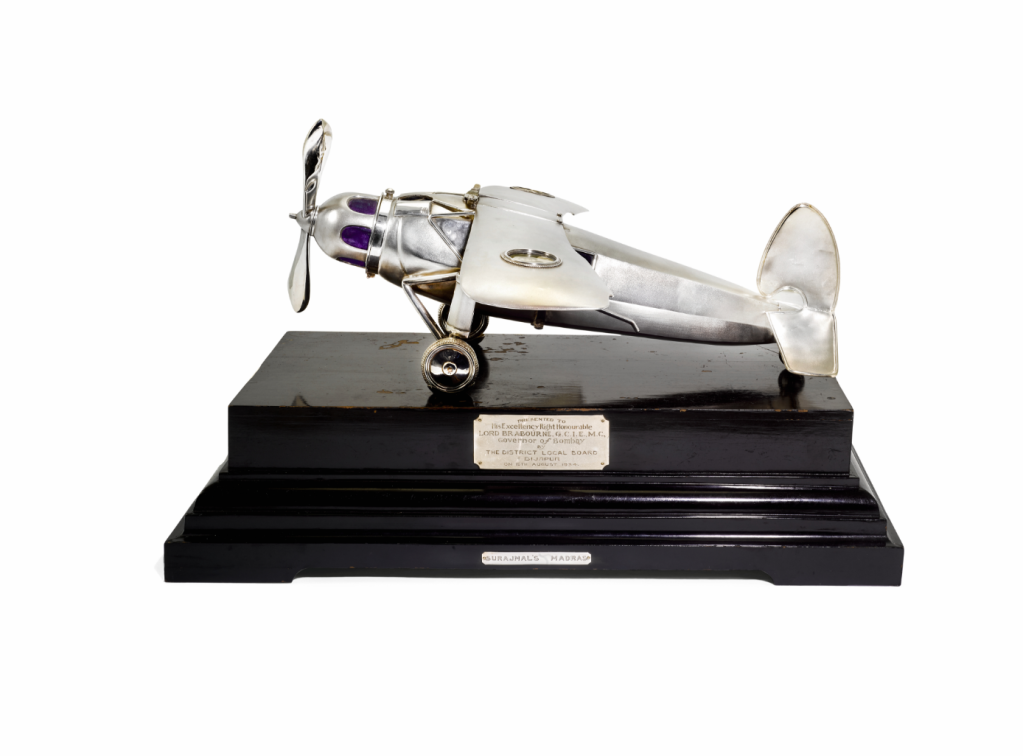 13. Silver ‘aeroplane’ document case’. This elaborate case was made to hold the 1934 address to Lord Brabourne from the District Board of Bijapur asking for financial help to overcome economic problems in the district of Karnatak. The engine compartment is hinged, the propeller turns and the wings fold (manufacturer’s instructions still present). Estimate £1,000 – 1,500