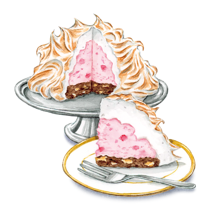This baked Alaska is based on a neapolitan ice cream, with a dark chocolate brownie base, dotted with chopped walnuts, a pastel pink strawberry ice-cream centre, and topped with a toasted vanilla-flecked meringue. It’s a riot of colour and flavour.