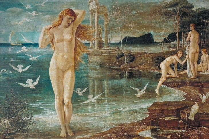 The received explanation for this — if the picture really was painted from life rather than being simply a blend of Botticelli and whimsy — is that Crane’s wife forbade him from using female models. The catalogue, however, prefers to interpret it as a case of gender fluidity, quoting with approval the comment of the painter W. Graham Robertson on Leighton’s remark: ‘Still, she was a fine, upstanding slip of a boy.’