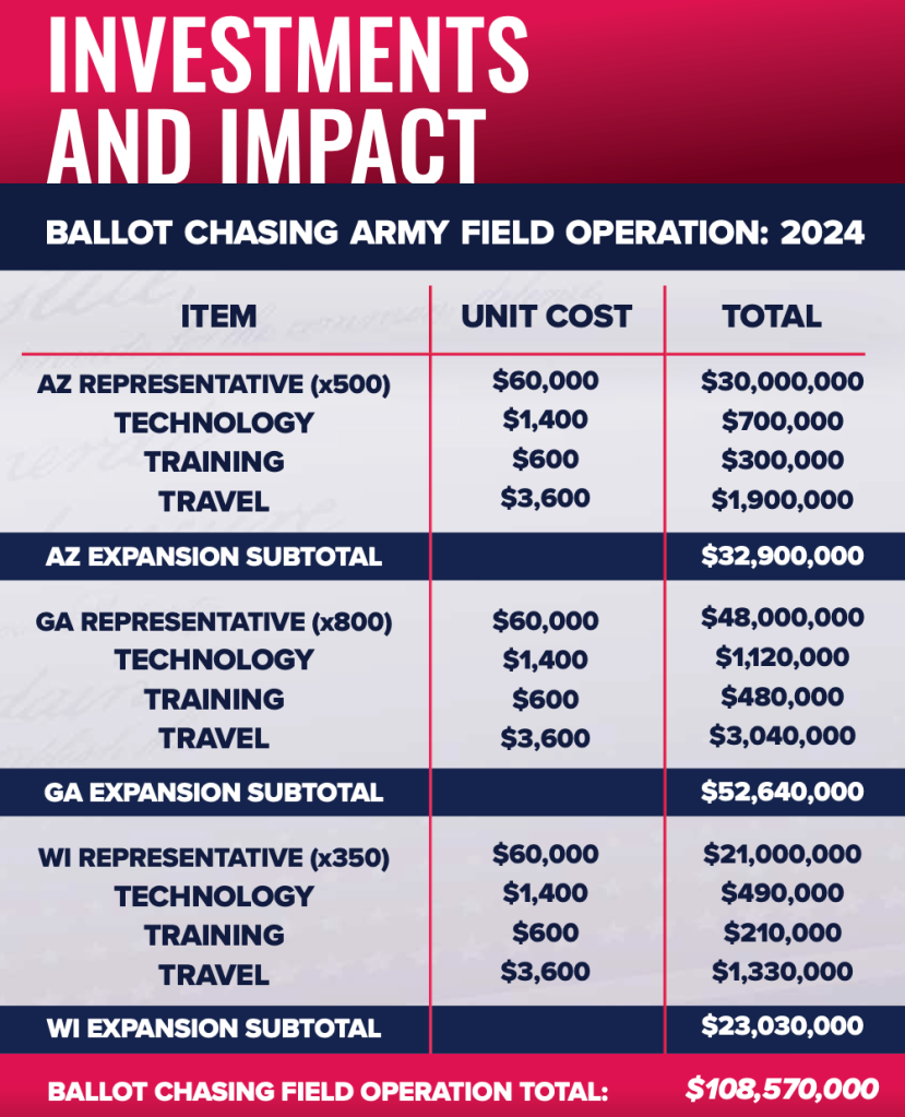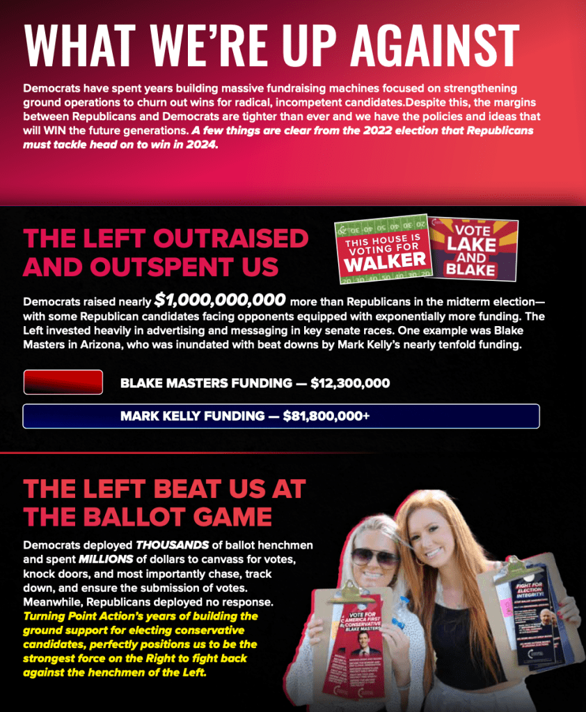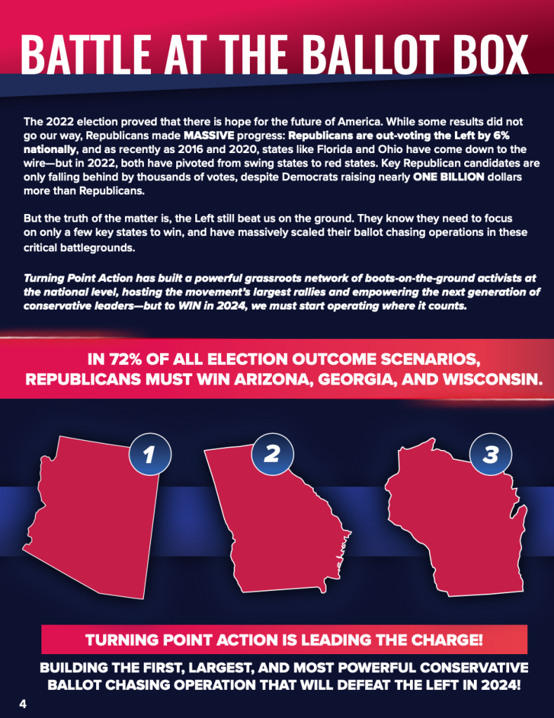 Despite some doubts, Turning Point Action is forging ahead. Its documents, which concede that Lake lost last year’s race for governor (claims that Lake is unsuccessfully litigating in court), lay out ambitious plans for over 1,000 full-time ballot chasers in the three key states it identified.