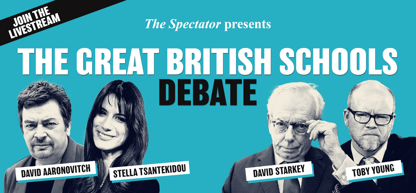 Toby Young, Spectator columnist and founder of the West London Free School, will team up with historian David Starkey to take on veteran broadcaster and author David Aaronovitch and political commentator Stella Tsantekidou. Locking horns over one of the most divisive questions in education today, they’ll go head-to-head over whether private schools are a stain on Britain’s conscience, and you can watch via livestream.