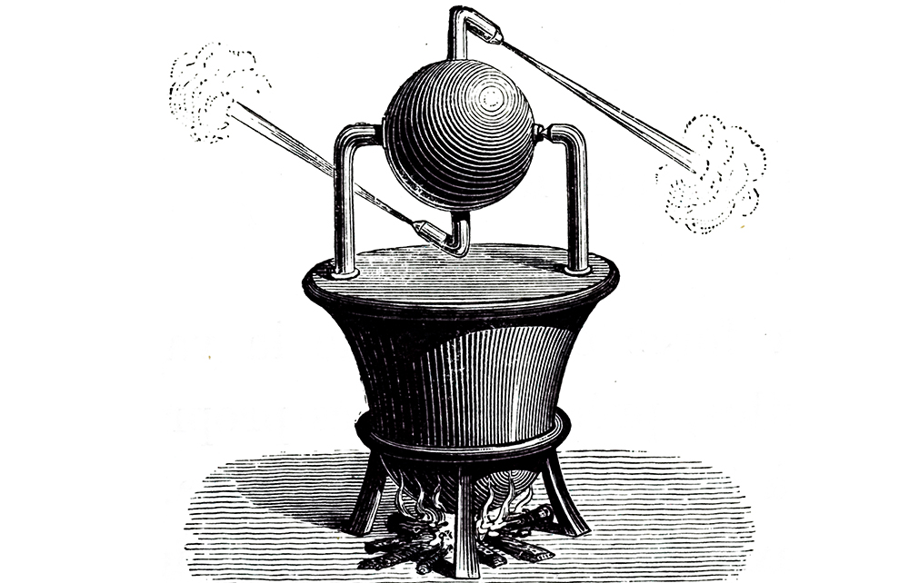 Even more dramatic was jet propulsion. Archytas’ animal bladder, looking like a flying pigeon (5th century bc), was pressured up with steam from a boiler and then released. Heron’s steam engine (1st century ad) might even have generated an industrial revolution. It consisted of a metal sphere, fitted with a curved nozzle on either side, propped up by two pipes which fed steam into it from a boiler. The steam, forced out of the nozzles, caused the sphere to rotate.