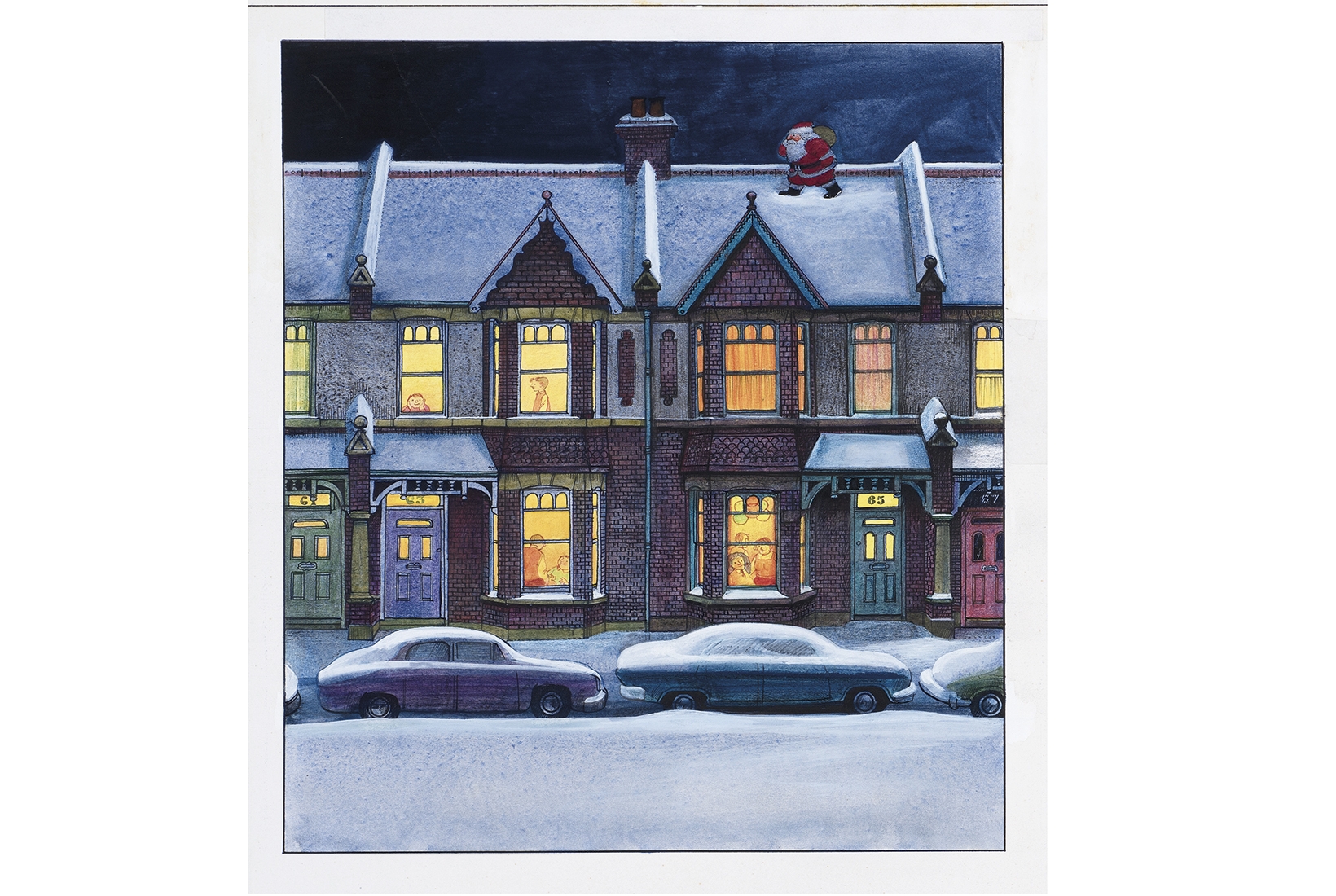 The hearth became a familiar trope in Briggs’s books. His stories may not, on the whole, be very Christmassy, but they do tend to be set in winter. Often, Briggs takes us to his own fireside, either directly, or via the rooftops. In Father Christmas, published in 1973, Santa touches down on Briggs’s childhood terrace in Wimbledon Park and squeezes into the chimney of the East Sussex cottage he has inhabited for the past 60 years. The Snowman recoils from the fire but follows a similar track, soaring over the Royal Pavilion in nearby Brighton, which glows as resplendently as Hagia Sophia (see article by Deborah Ross).