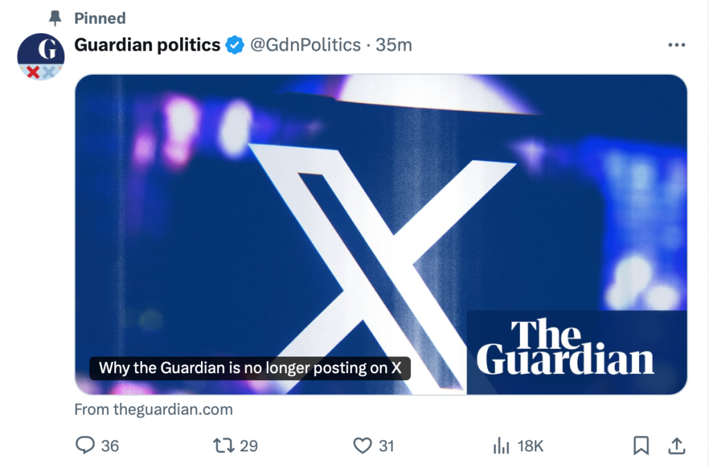 Sharing a link to an article explaining ‘why the Guardian is no longer posting on X’ on the site itself, the Grauniad editorial states rather pompously that: