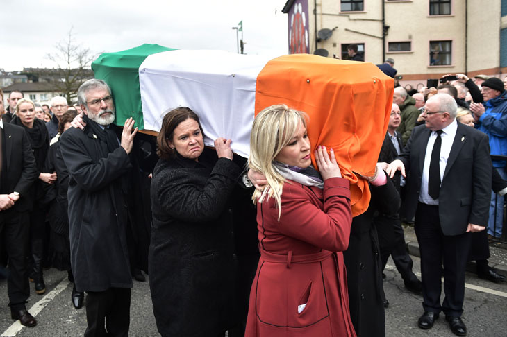 While the Brexit vote is far from the source of Northern Ireland’s disagreements, it has brought a whiff of structural fluidity to events, which Sinn Fein is instinctively keen to exploit. After a long spell mired in the administrative minutiae of Stormont, studiously consolidating its respectability, the party can suddenly feel the wind in its hair: an exhilarating, free-ranging sense of wider ground to be gained. In an article in the Guardian after the death of McGuinness, Gerry Adams was frank about his party’s motivations. ‘There was not a bad Martin McGuinness and a good Martin McGuinness,’ Adams wrote. Although there had been ‘a different strategy’, the objective of a united Ireland remained the same — and now that Sinn Fein had made dramatic political advances, it was time for ‘a necessary conversation on a new Ireland’.