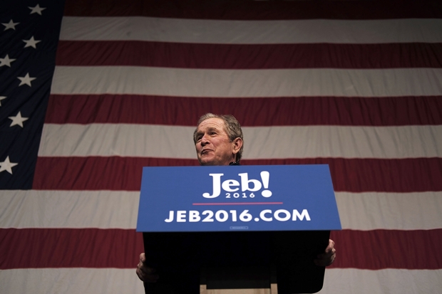 It seems like madness. Everybody knows that Jeb Bush’s candidacy has from the start been crippled by his name. Americans don’t want another Bush in the White House. Republicans may not be quite as hostile towards George W. as Labour grassroots supporters are towards Blair, but they don’t want to remember the President who brought them unsuccessful wars and an economic crisis. Last year Jeb tried to dodge the issue by rebranding himself as ‘Jeb!’, but that hasn’t worked. So in recent weeks, he has changed tack and emphasised his pride in his family. He’s said his father, George H. W., the 41st president, is ‘the greatest alive’; and he’s dragged out his elderly mother Barbara to campaign for him. And now, Dubya has hit the trail in support of his brother.