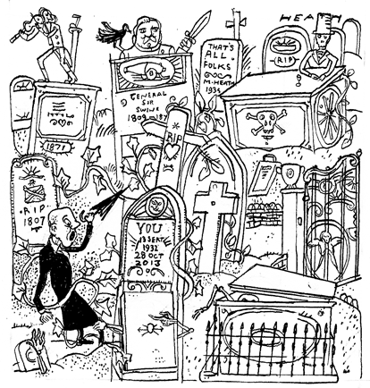 I meet Ann, who is my friend, in Highgate, where Stoney is buried. She has visited the grave, just as she’s visited all 100 graves, travelling tons of miles up and down the country, often with a long-suffering family member in tow. Her husband, either of her grown-up daughters, or her mother, now 82. She felt sorriest for her mother when they did Spike Milligan’s grave in Winchelsea, East Sussex. ‘It’s a very windswept place and it was so cold my mother’s fingers actually went white.’ Spike’s epitaph — ‘I told you I was ill’ — was once voted the nation’s favourite, and dying certainly does provide the opportunity to have the last laugh, should you wish to take it. I want ‘Never ill, now this?’ on my grave, while Ann wants: ‘Found the plot… at last!’ Apparently the American comedian Jack Benny wanted ‘Did you hear about my operation?’ but was, alas, talked out of it.