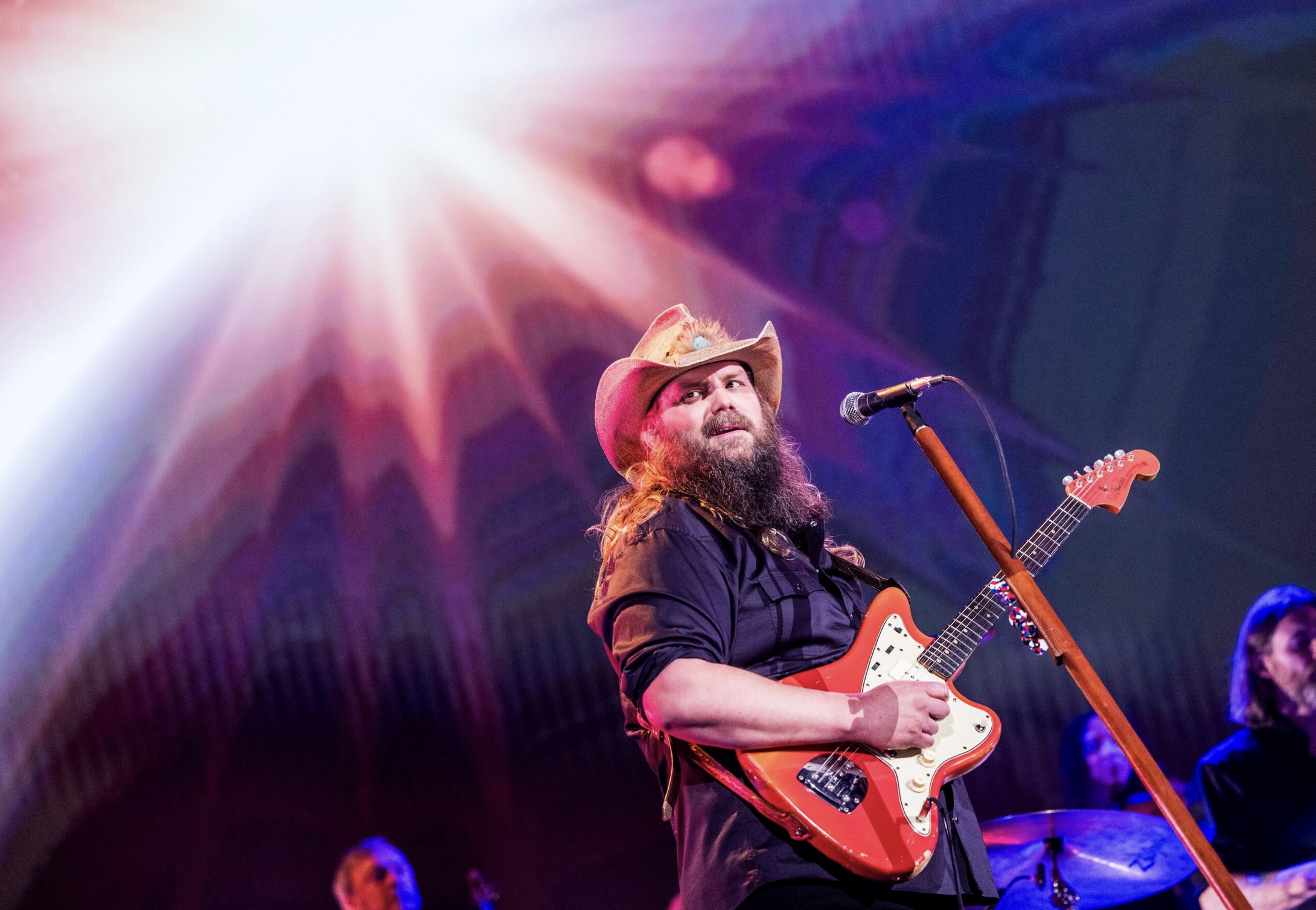 Chris Stapleton is a barrel-chested man of 46, who hides his face beneath a beard that must have taken years to grow, hair that tumbles down past his shoulders and a hat that could probably accommodate rather more than ten gallons. He sings songs about being imperfect, with a band behind him making a sound that one might have heard in 1972. He is so purely, absolutely and definitely American he might as well have petrol for blood and ‘The Star-Spangled Banner’ on a permanent loop in his head.