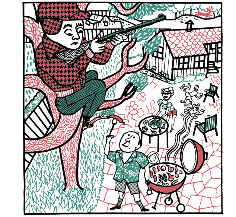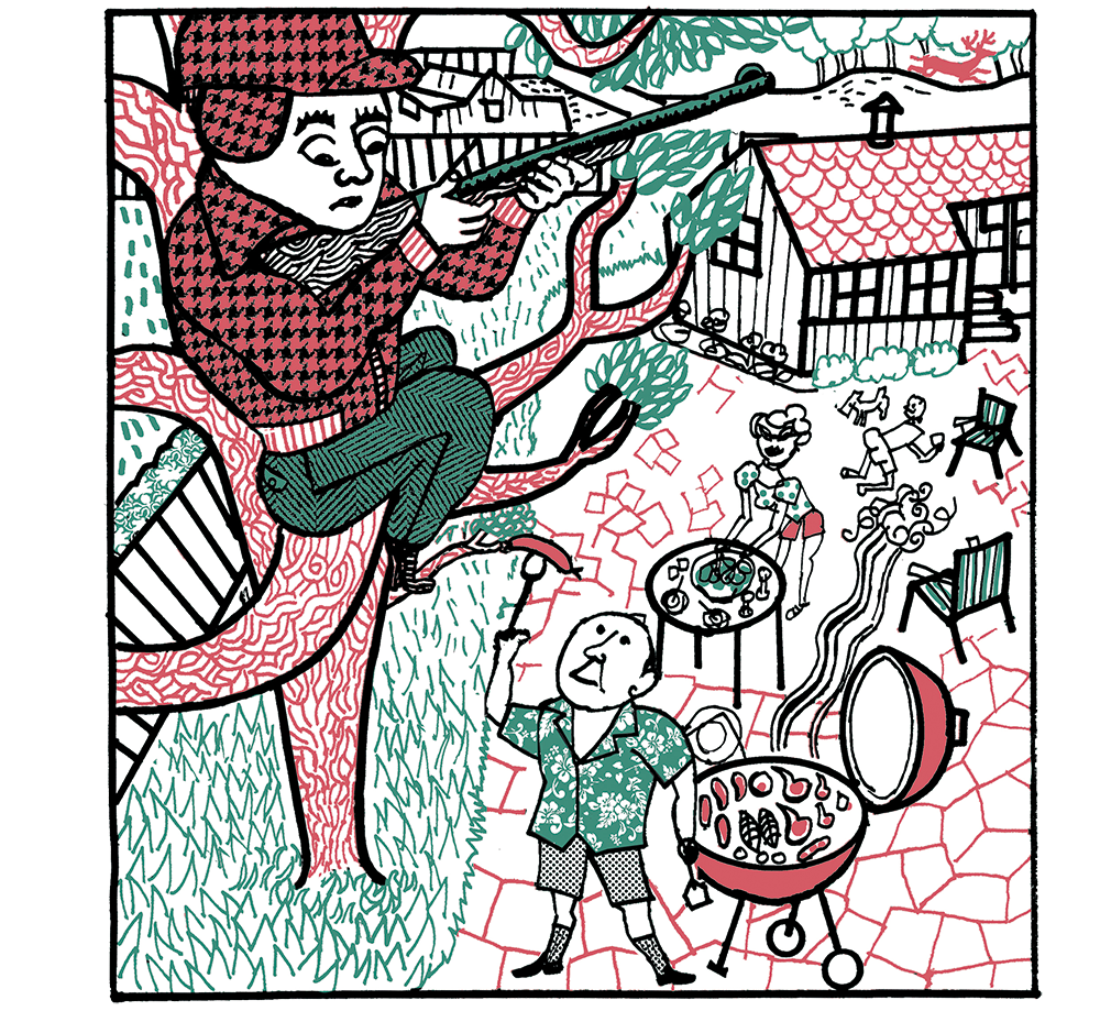 A perch some 20 feet up a backyard tree offers a peek into every manner of activity in the neighborhood. One guy in a uniform sets down his running leaf-blower, backs into a bush, squats and relieves himself. Another guy wearing pastel and khaki rides tight circles on his mower; his facial contortions suggest he’s singing his ass off. A woman washes dishes at her kitchen sink. A man grills on his deck and searches for me in the treeline.