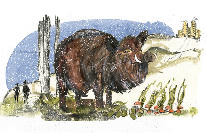 The hog is gone. How, nobody can say. The Master’s Picardy horses are untouched and the house’s silver plate lies intact in its strongbox. The dogs? Grizzling in their kennel, busy chewing bones someone brought them in the night. The pigsty gate yawns unbolted. A trail of acorn husks leads through the yard and out toward Wytham wood, muddled with the stamp of men’s boots and a steady, treading line of cloven hoof-prints.