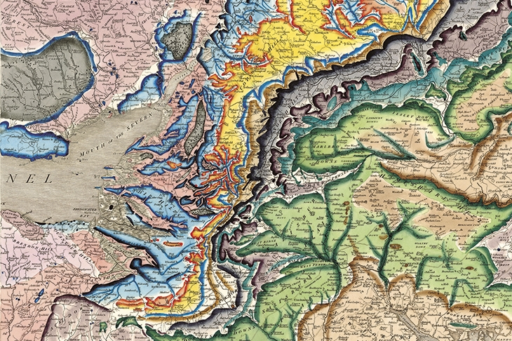 It failed financially, but introduced radical notions to a country rapidly rejecting biblical chronology. The original biostratigrapher was a disturber of ground, Robert Macfarlane observes in his foreword, ‘a terranaut’ whose indefatigable delving beneath Blake’s green pleasance lent England ‘a fabulous plumage’. Smith’s Cotswolds blaze with reds and yellows, his Rutland with salmon-pink and turquoise — and his colour legend and scales are still standard. This is a suitably prestigious tribute, with marbled endpapers, facsimile maps and pages from sketchbooks, and essays touching on canal-building, cartography, drainage, mineralogy, mining, palaeontology, water-finding and other topics.