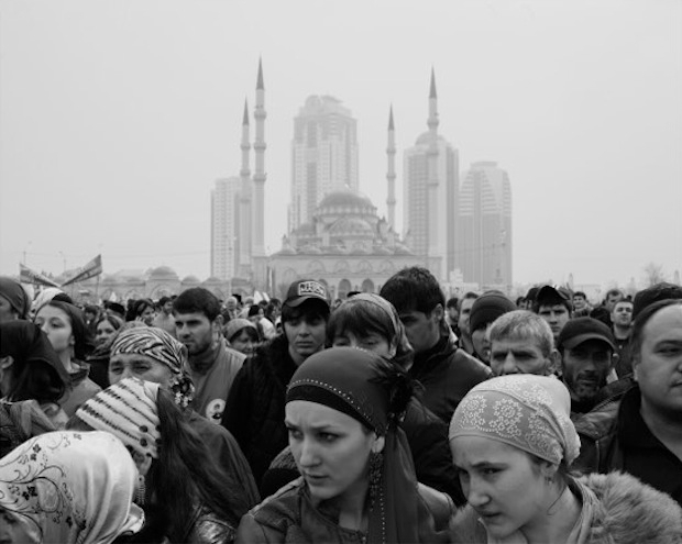 Monteleone’s pictures, which examine Chechen identity, are initially startling. The last official Russian invasion of Chechnya finished in 2009, which means the republic’s name is synonymous with apocalyptic images of destruction – of soldiers in tanks, bloodied corpses and buildings reduced to rubble. By contrast, Monteleone’s lens focuses on an apparently shiny, happy new reality – all gleaming citadels, sublime mountainscapes and doll-like figures in national costume. Yet the Italian photographer is playing a sophisticated game. This is a landscape stalked by the ghosts of Chechnya’s past – decade after decade of suffering hidden behind a façade of Dubai-style architecture and white-lace-clad Stepford brides.