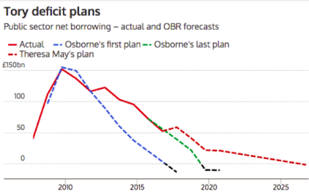 At today’s Tory manifesto launch, Theresa May put some clear blue water between herself and the Cameroons as she ditched many of the 2015 manifesto pledges. But there is one area of continuity. May managed to continue George Osborne’s longstanding tradition of putting off balancing the books.