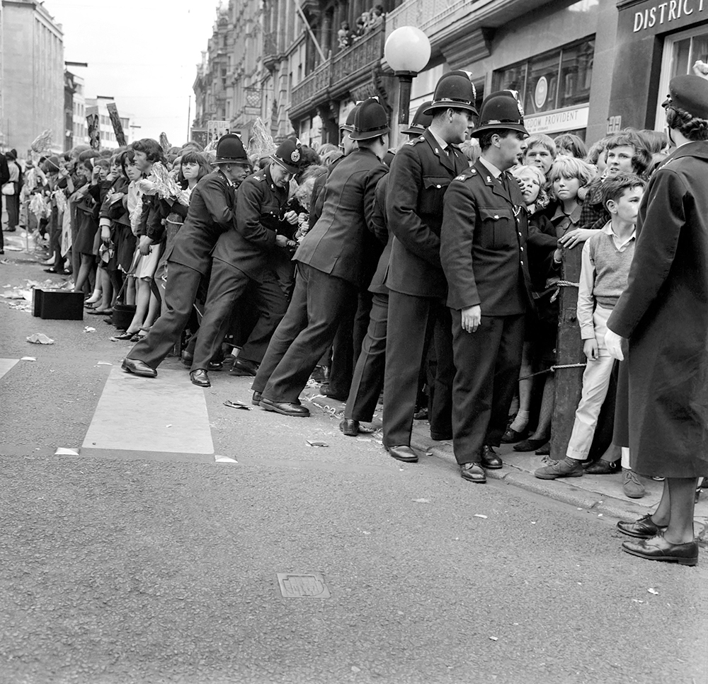 Police hold the crowds at bay before the Beatles arrive for the premiere of A Hard Day’s Night in Liverpool, July 1964. Watford/Mirrorpix via Getty Images
