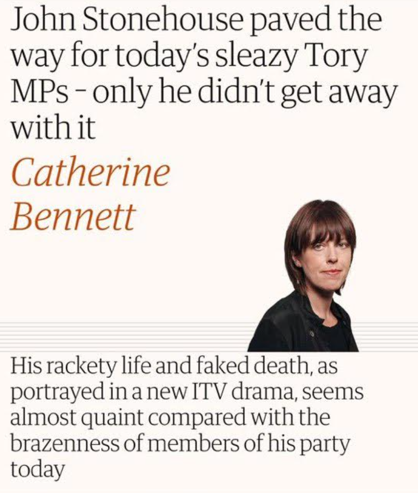 There’s just one problem of course – the new ITV series is about John Stonehouse, a Labour MP. You might have thought that, while watching the series, claims about Soviet contacts and prostitutes in Czechoslovakia might have given Bennett and her Observer colleagues pause for thought. Clearly not. A correction has now been inserted online noting that ‘an earlier version of this article mistakenly referred to John Stonehouse as a Conservative MP.’ And the article has now been updated, to criticise the ‘brazenness of MPs today.’ So, all parties, rather than, er, just the Tories.