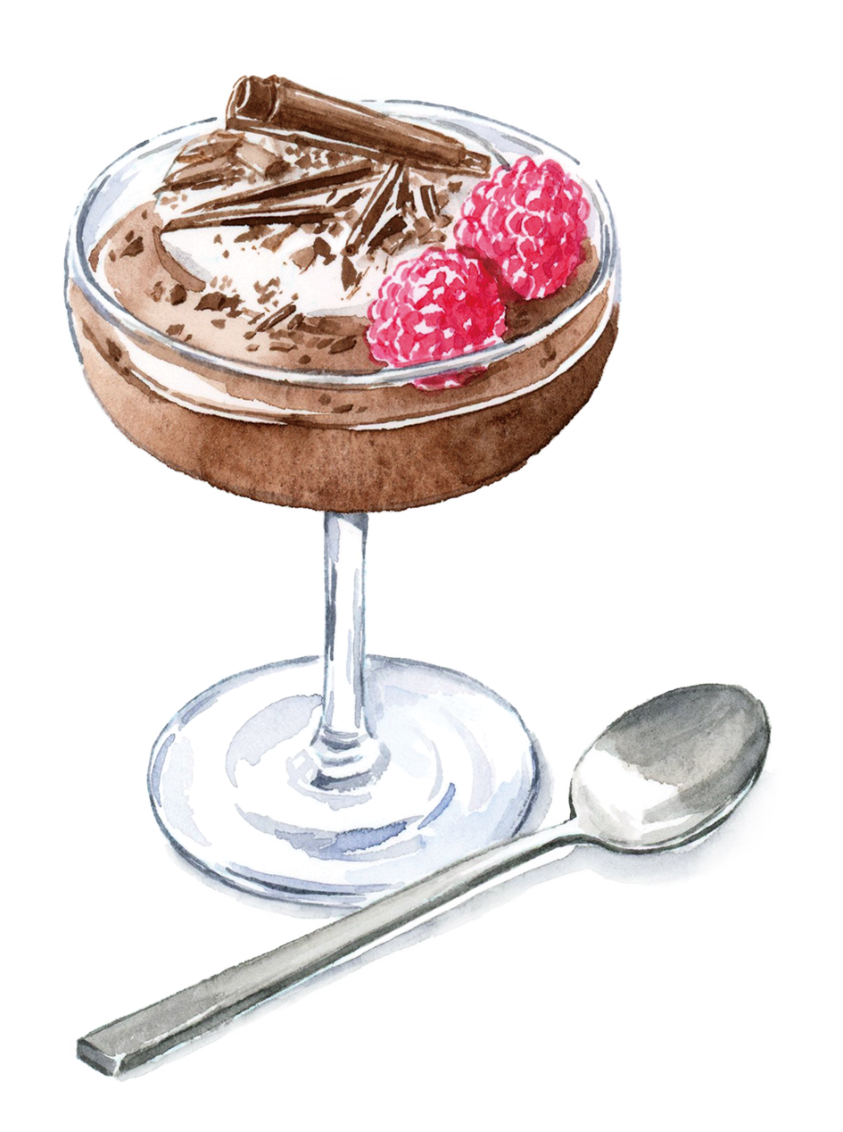 Like all the best puddings, there is no end of ways to tweak or customise the dish to your particular fancies. A scant teaspoon of ground cardamom or a couple of shots of espresso or bourbon or dark rum will transform it. Crumbled halva or shards of honey-comb, finely diced crystallised ginger or smashed amaretti biscuits all bring contrasts of texture as well as flavour. Sometimes it’s hard to see beyond salted caramel – hot, drizzled from the pan, or cold, in big dollops. Hot-pink forced rhubarb, poached for as short a time as possible, is possibly the prettiest accompaniment. If you’re more chic than I am, then the only real answer is a drizzle of really good olive oil and a scattering of flaky salt. I served this iteration with softly whipped cream (truly, always a winner with chocolate mousse) and a generous spoonful of boozy morello cherries.