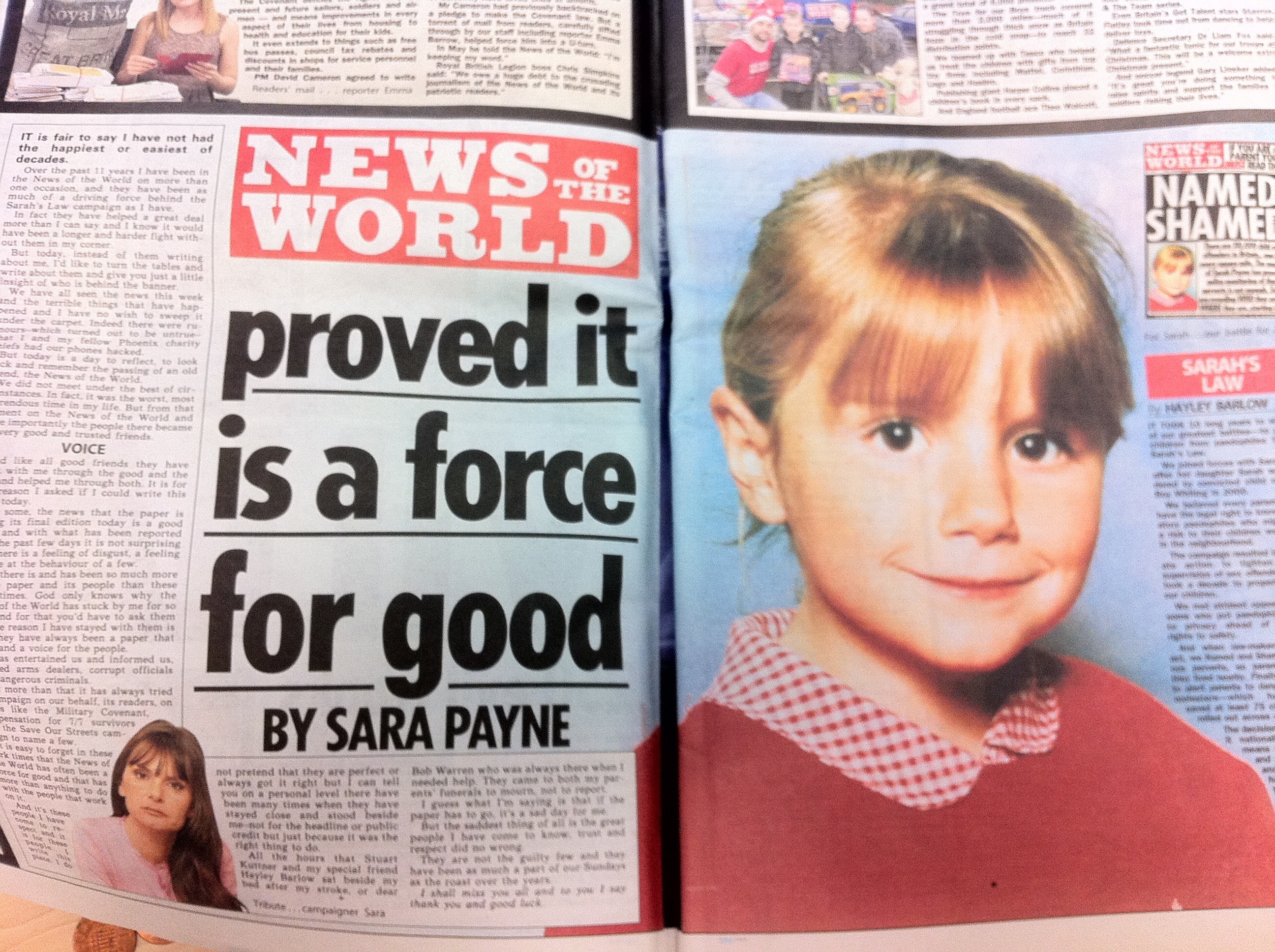 “The News of the World proved is is a force for good.” So said Sara Payne, the mother of the murdered schoolgirl Sarah Payne, in a column for the final edition of the paper. Its writers and editors had supported her unerringly, she wrote, in her campaign for tighter laws against child molesters. “I shall miss you all and to you I say thank you and good luck.”
