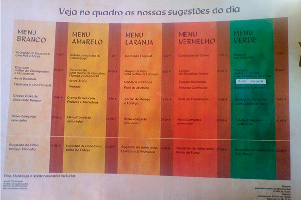 The appallingly bad photograph below was taken on my mobile phone about 15 years ago. It shows the menu layout from the Lisbon restaurant Chapito. I have never seen any other restaurant adopt such an ingenious format. You are given five set menus to choose from (white, yellow, orange, red and green) with a suggested wine for each. But you are perfectly free to substitute any dish from any other menu, or omit a course if you want. It is a brilliant example of what is sometimes called ‘choice architecture’.