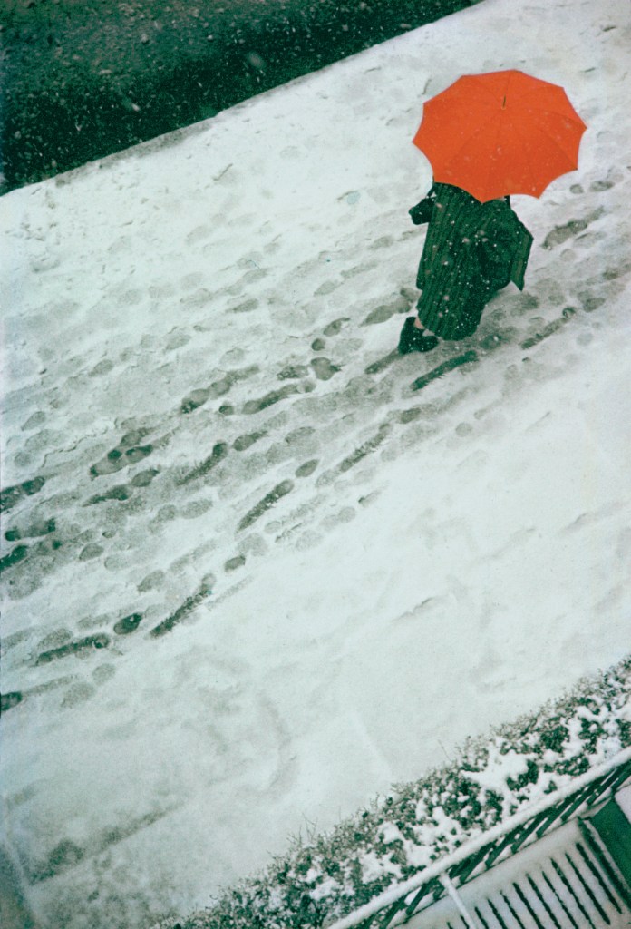 By contrast, the colour work is talkative. The familiar New York tropes are ever-present: traffic lights, yellow taxi cabs, signage of all kinds, the weather as a prop, the striving human subject. And the borrowings from abstract art: a touch of free-floating colour here or there (a red umbrella, a dab of neon), large areas of empty foreground blocking the view. The analogue reds and greens look bleached, because Leiter liked to experiment with expired film stock. In ‘Footprints’ (c. 1950, see below), shot from directly above, a woman negotiates a snow-covered sidewalk, beneath a bright umbrella, pursued by the prints made by all the previous feet. In ‘Mondrian Worker’ (1954), a workman assembling or disassembling a shed appears to be imitating the blocks of colour and black dividing lines of a Mondrian. In ‘Taxi’ (1957) a masculine hand, bronzed, cufflinked, urbane, holds a strap – all that can be seen in the rear seat of a passing taxi. Pure Mad Men.