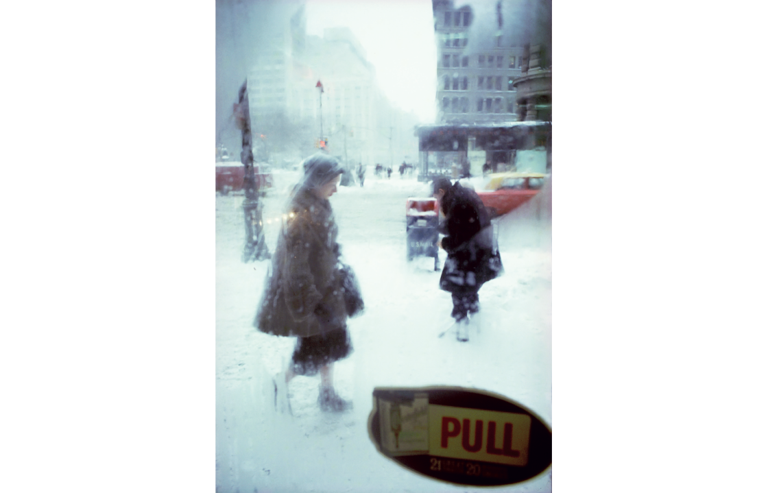 Leiter’s style was oblique from the outset: interrupted views, windows and mirrors, glimpses and reflections, confusions of outside and inside, individuals seen through mist and steam, rain and snow – so many veils. His reliance on available light meant wide apertures and a reduced depth of field, as did the slow emulsions of early colour film: a constant dialogue between what is in and out of focus. The constraints encouraged a wise passivity rather than any attempt to control outcomes. Leiter was uninterested in cropping his prints or nudging the development process. The street was itself an improvisation, the sidewalk a ballet of cross-purposes. Above all, he explored the gap between what is seen and what is known: ‘A person’s back tells me more than the front.’ Isolated by his camera, his subjects tend to look preoccupied. He often used a telephoto lens, which sees only what it wants to see, compounding his tendency to abstract from a scene in the interests of a general aesthetic statement.