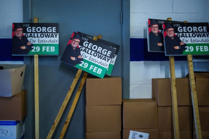 Placards supporting George Galloway stand in his election campaign headquarters in Rochdale (Credit: Getty images)