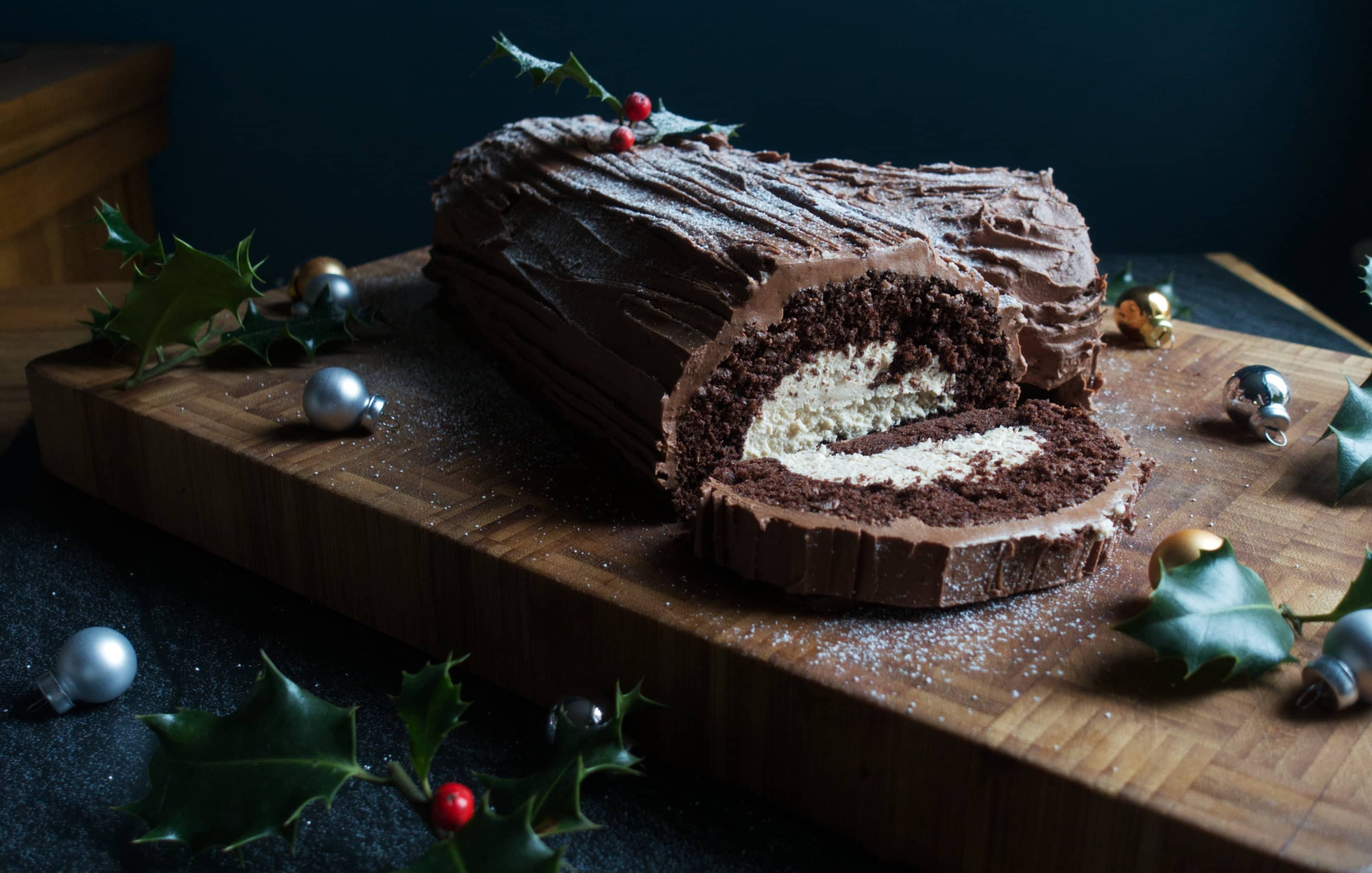 A yule log (sometimes called a bûche de Noël) is a roulade: a light sponge, normally plain vanilla sponge, baked in a Swiss roll tin, and then rolled with a sweetened cream filling, decorated with chocolate ganache or buttercream to resemble a fallen log. It is, basically, a chocolate-covered swiss roll.