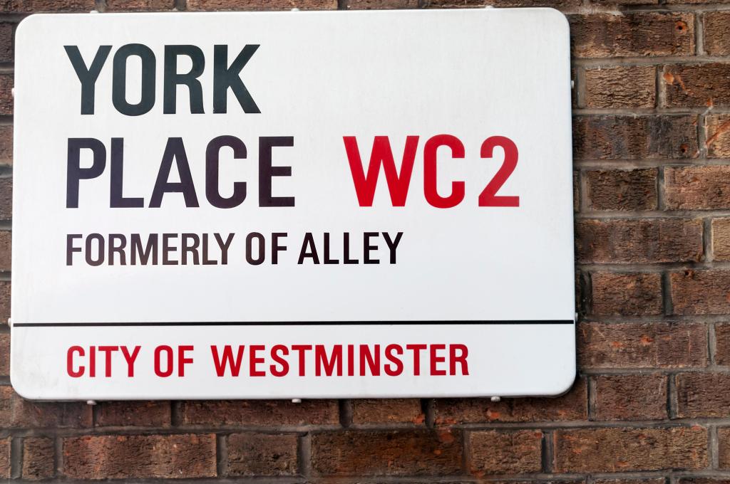 - York Place, just south of the Strand, used to be called Of Alley (the modern street sign still commemorates the fact). The name came about because when George Villiers, the Duke of Buckingham, sold the land to developers in 1672, he insisted that every element of his name be reflected in newly created streets. So there was George Street, Villiers Street, Duke Street, Buckingham Street… and Of Alley.